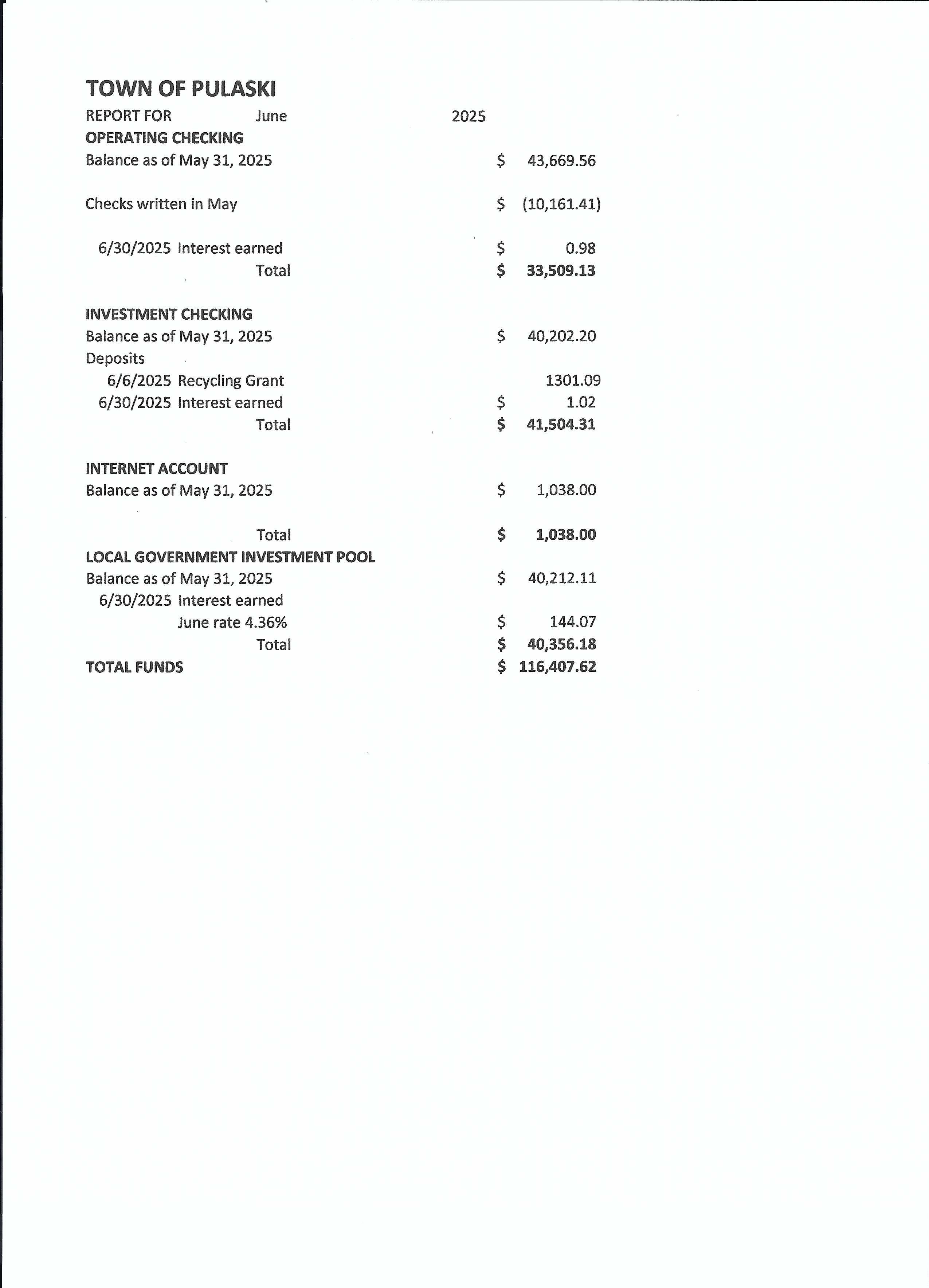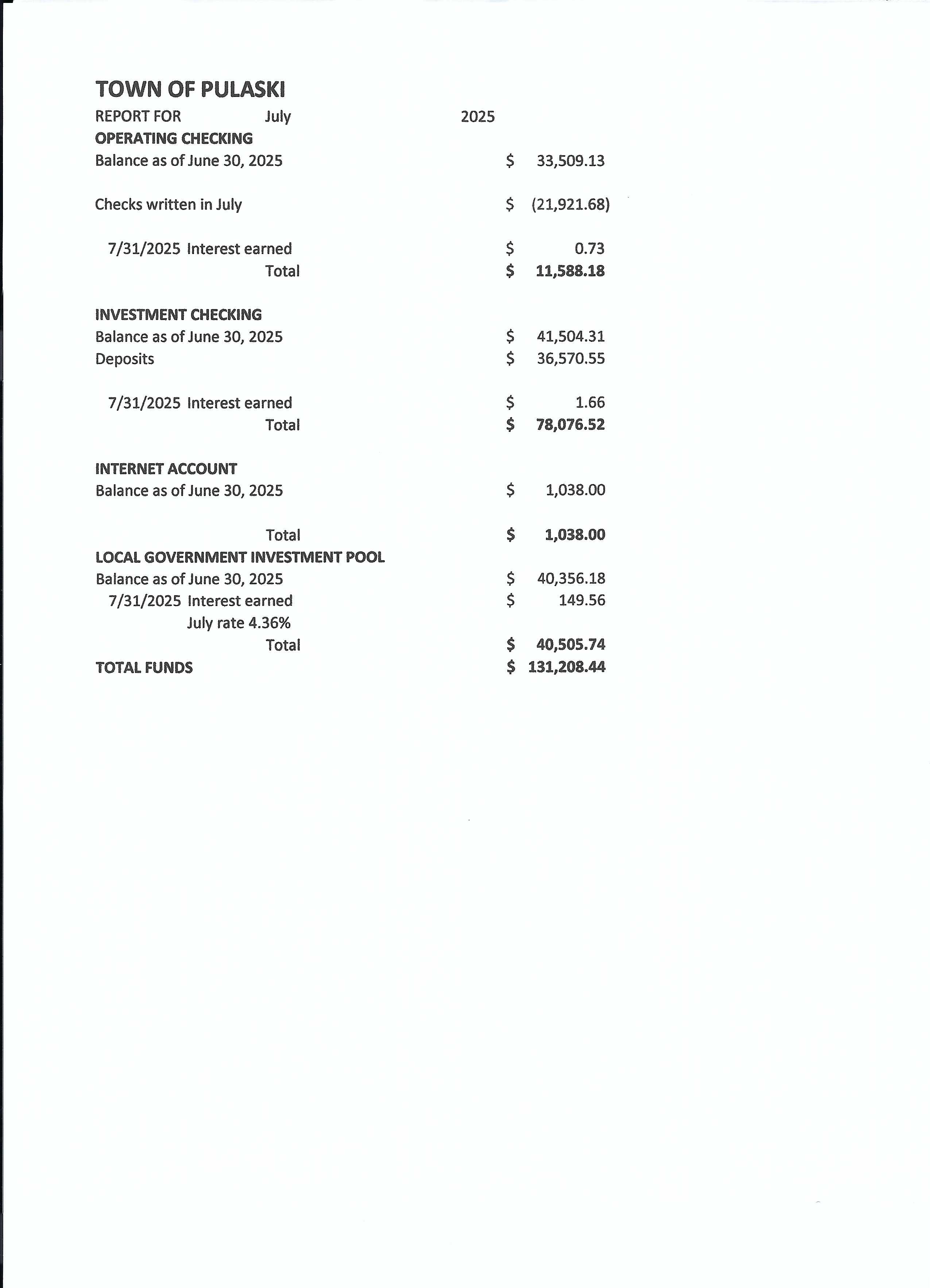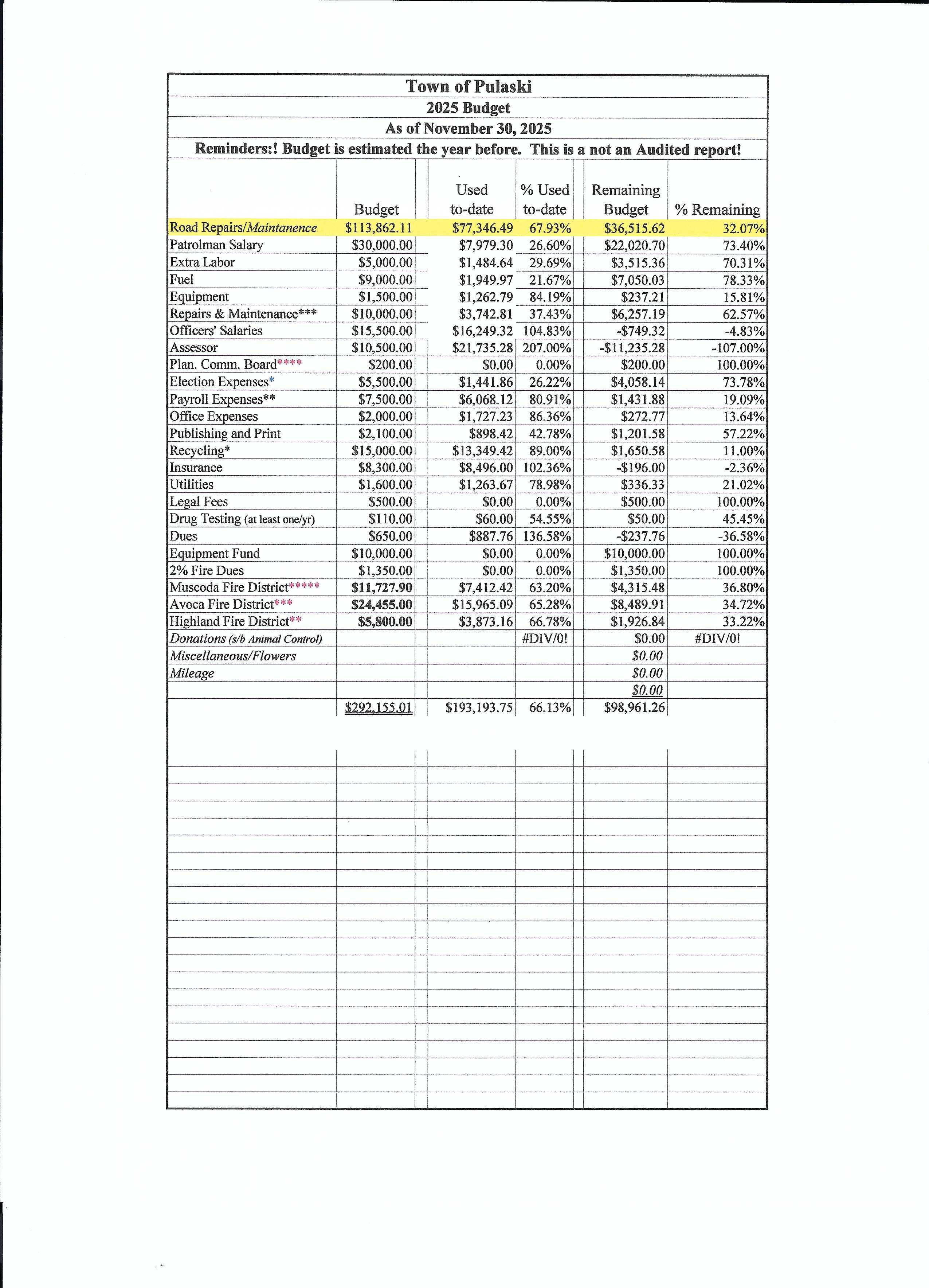 For Town of Pulaski questions regarding budget numbers contact Casey Michek, Treasurer or Sheila Wardell, Clerk
