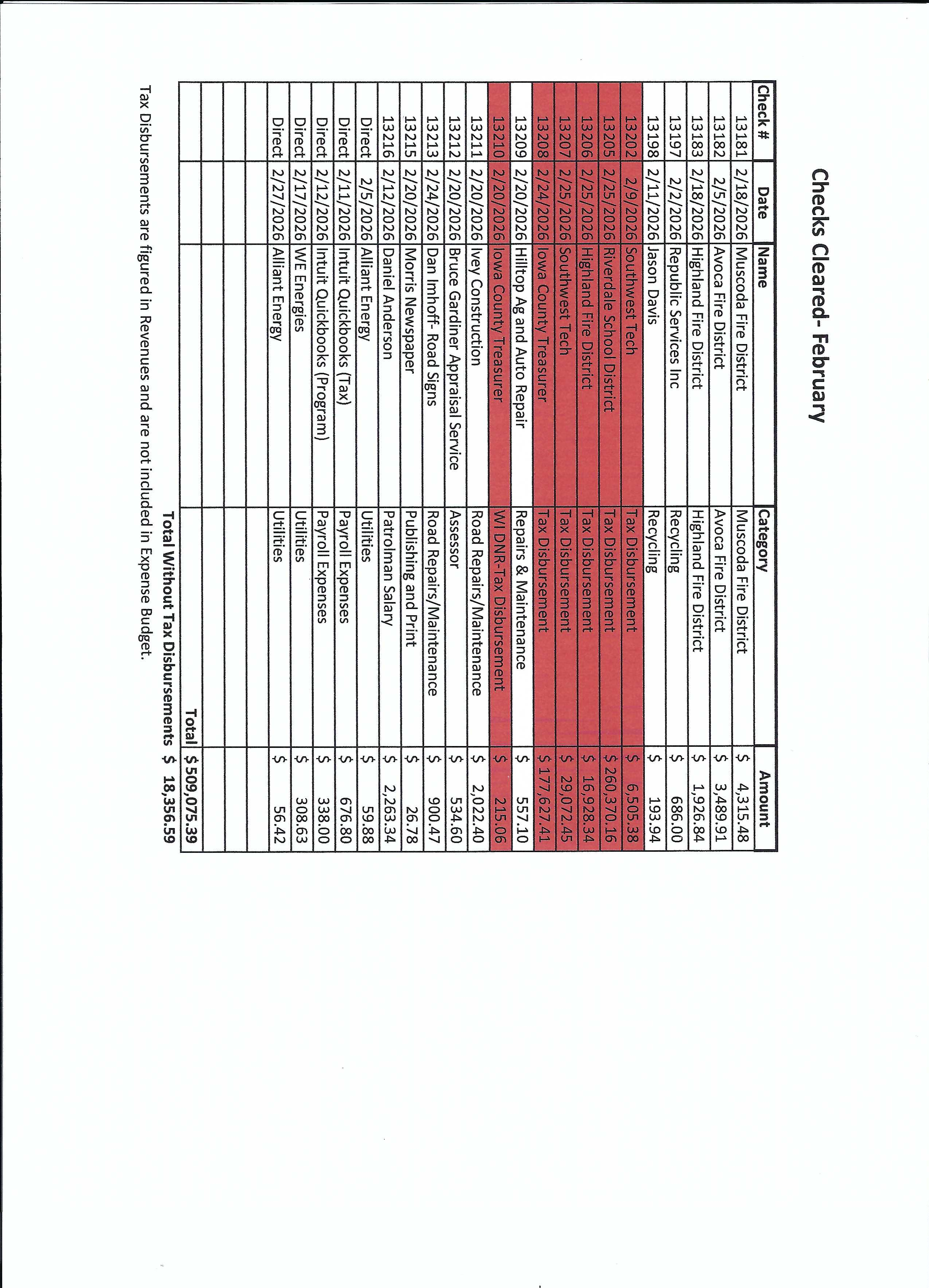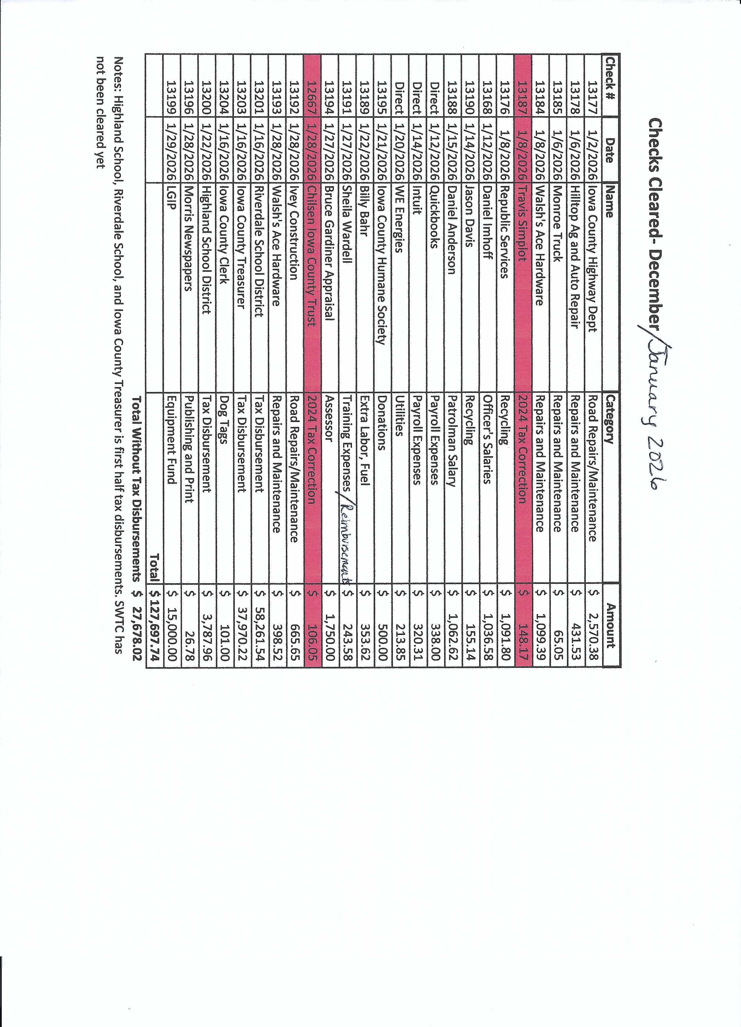 December 2025 Treasurer and Check Detail Report note that there are large expenditures paid out in January 2026 to Iowa County and School Districts